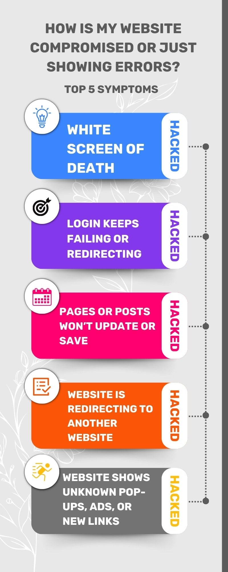 Fixing a Website With Hacking Issues- This error occurs when a website has been hacked and compromised, and requires extensive security measures to be put in place to remove malware, viruses, or other malicious code. Fix a website requires malware removal rightaway.