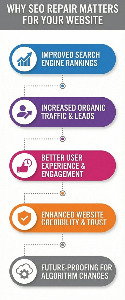 SEO repair helps correct all underlying issues by identifying the source of the problem and making the site fully optimized again. It improves visibility, restores rankings, and ensures your website meets Google’s technical and quality guidelines.